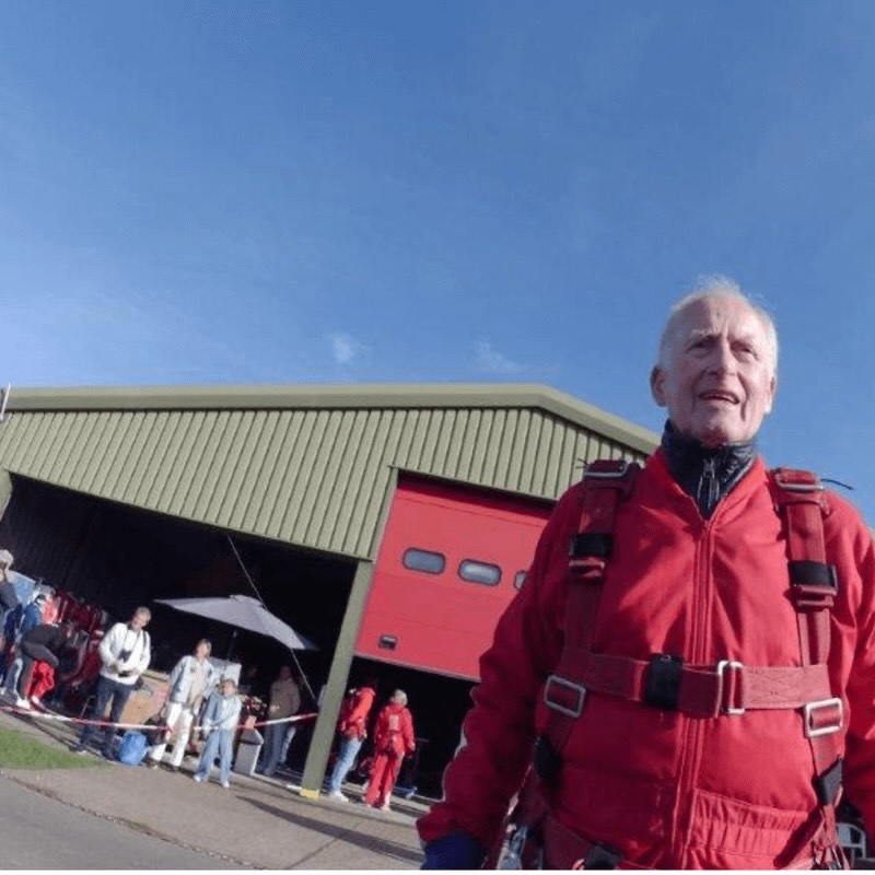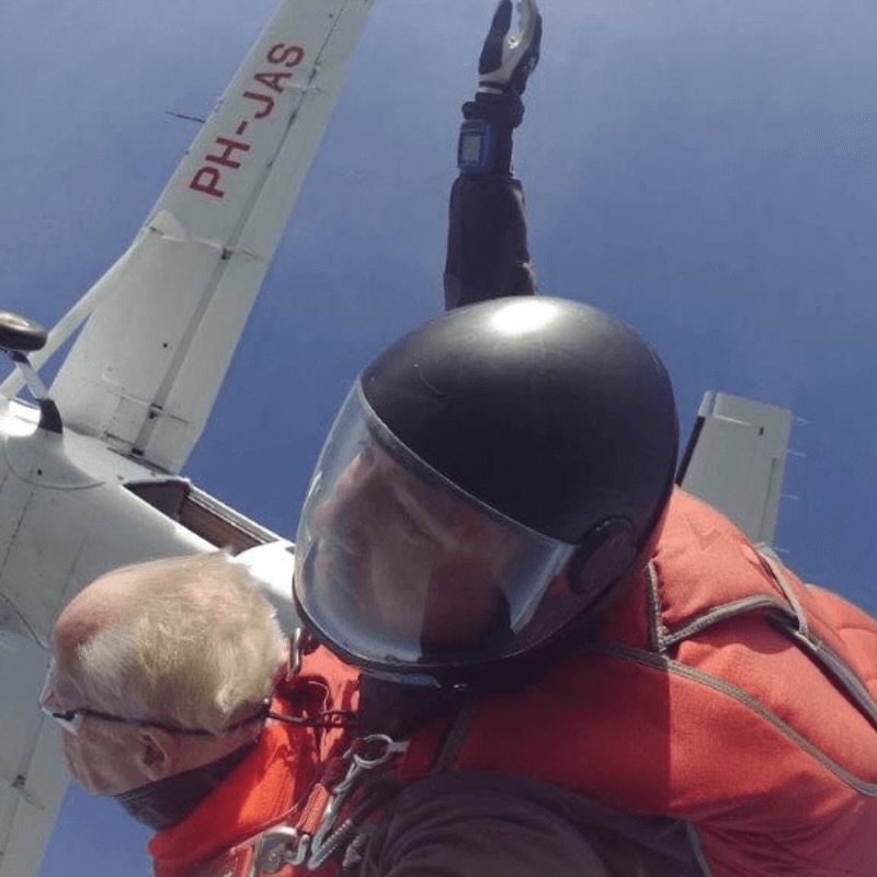 “Toen ik mijn kleinzoon en dochter zag parachutespringen, dacht ik: dat wil ik ook!” vertelt Boele lachend. “Ik heb mijn schoonzoon meteen gebeld en gezegd: ‘Je moet me daarheen brengen, want dit ga ik doen!’ Mijn vrouw wilde niet, maar ik wel!”